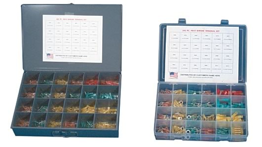 20 pcs 22-18 butt, 20 pcs 16-14 butt, 20 pcs 12-10 butt, 20 pcs 22-18 rings #10,1/4,5/16,& 3/8, 20 pcs 22-18 spades #10, 20 pcs 16-14 rings #10,1/4,5/16,&3/8, 20 pcs16-14 spades, 20 pcs 22-18 .250 Male & Female, 20 pcs 16-14 .250 Male & Female, 20 pcs 12-10 .250 Male & Female, 20 pcs 12-10 rings #10,1/4& 5/16